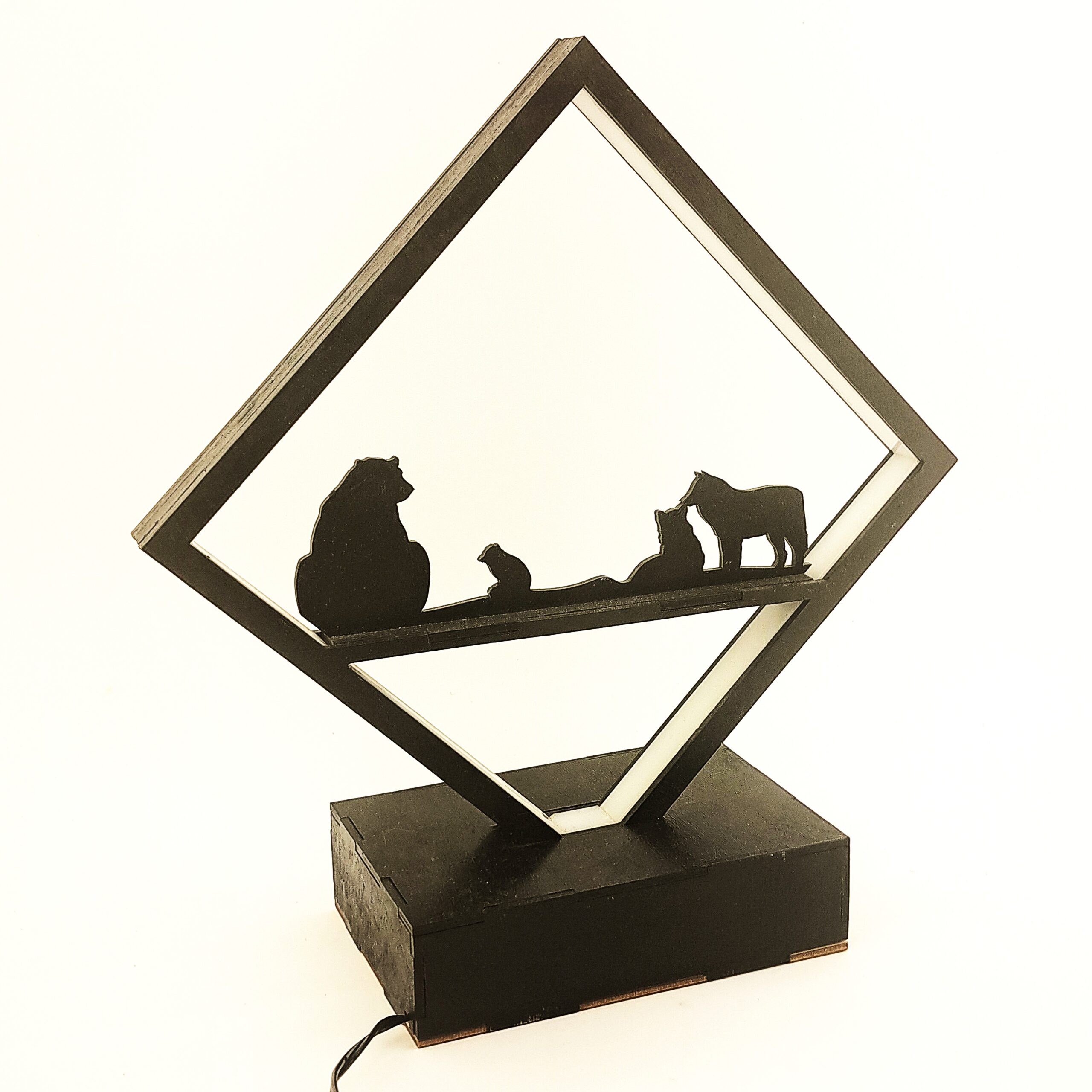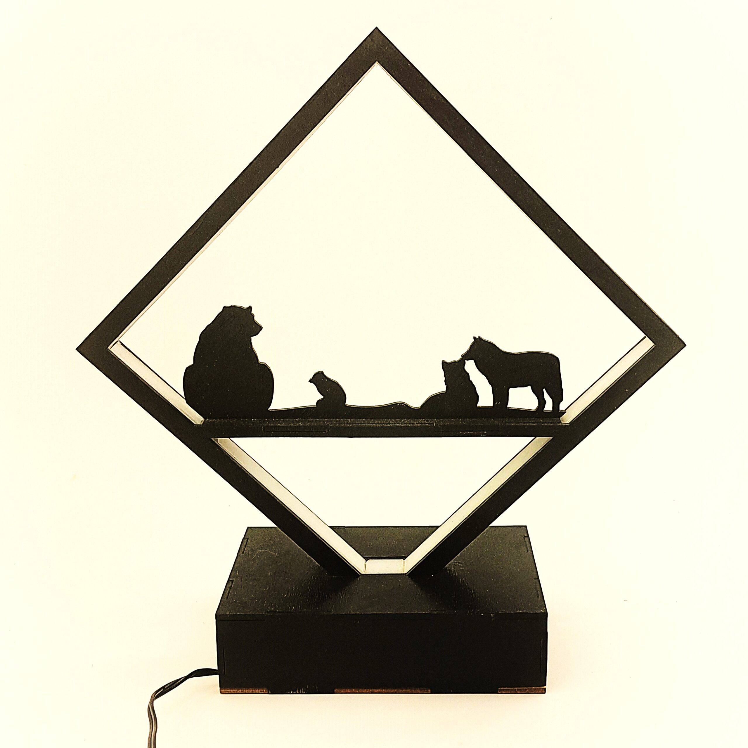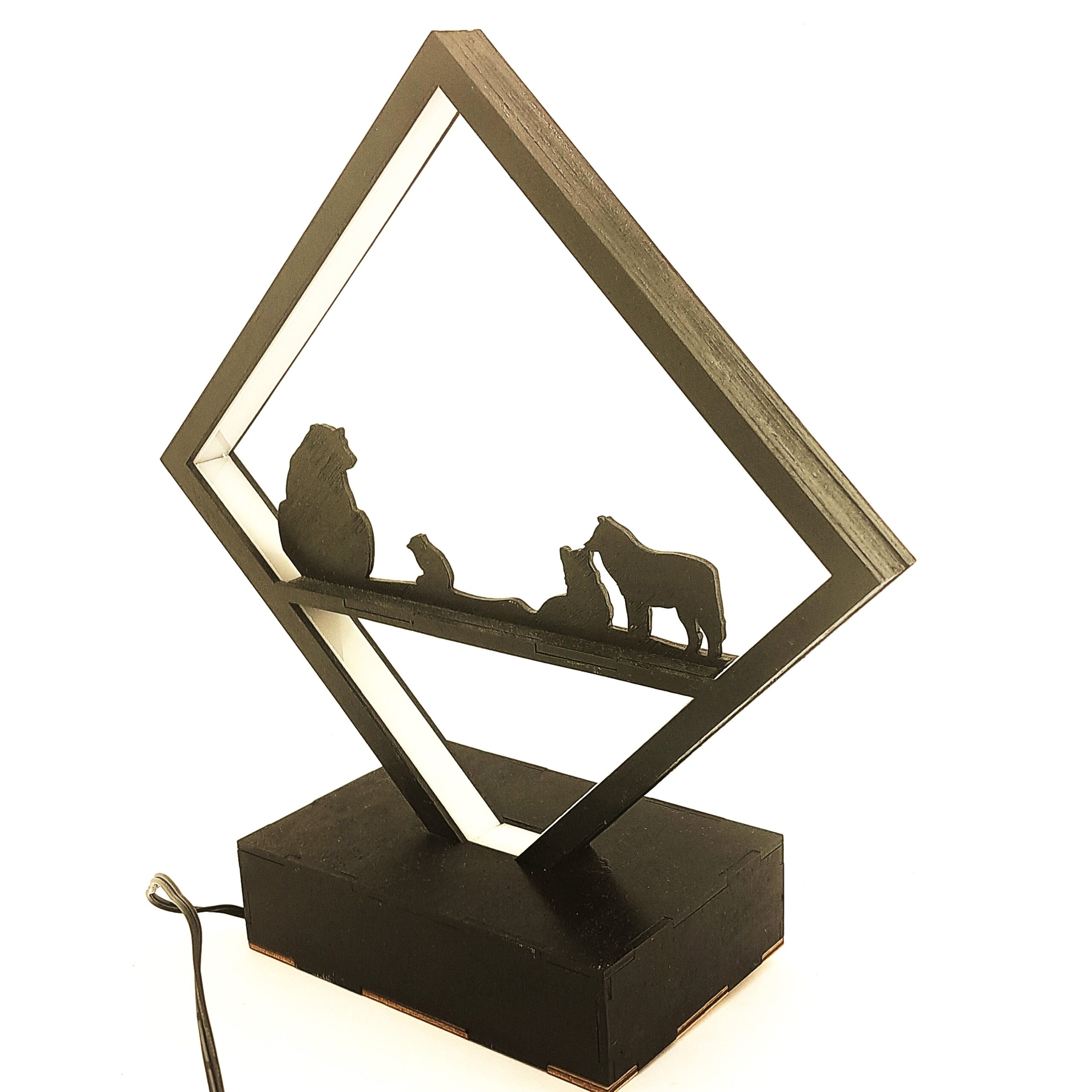 Odkryj wyjątkowy klimat Północy dzięki naszej lampce LED „Polar Light” w kształcie rombu z grafiką przedstawiającą zwierzęta polarne – niedźwiedzia, lisa arktycznego i wilki. To niezwykłe połączenie naturalnych materiałów, ciepłego światła i nordyckiej symboliki, które stworzy w Twoim wnętrzu niepowtarzalny nastrój.