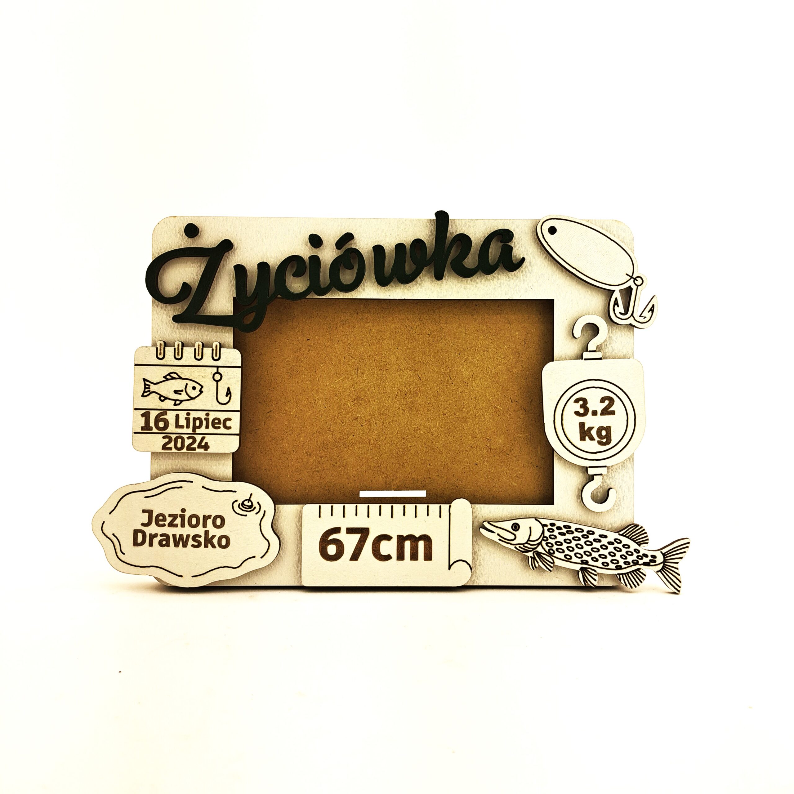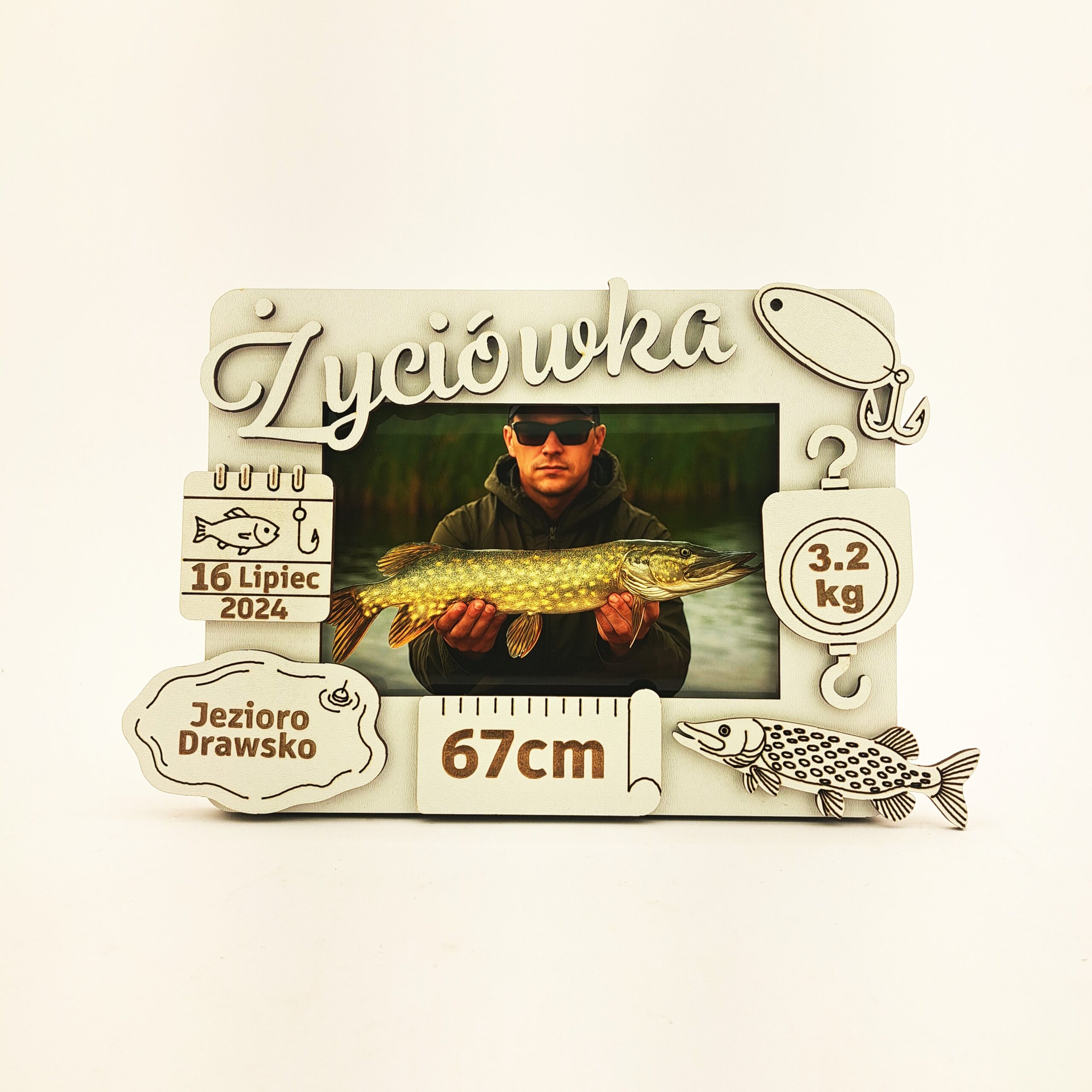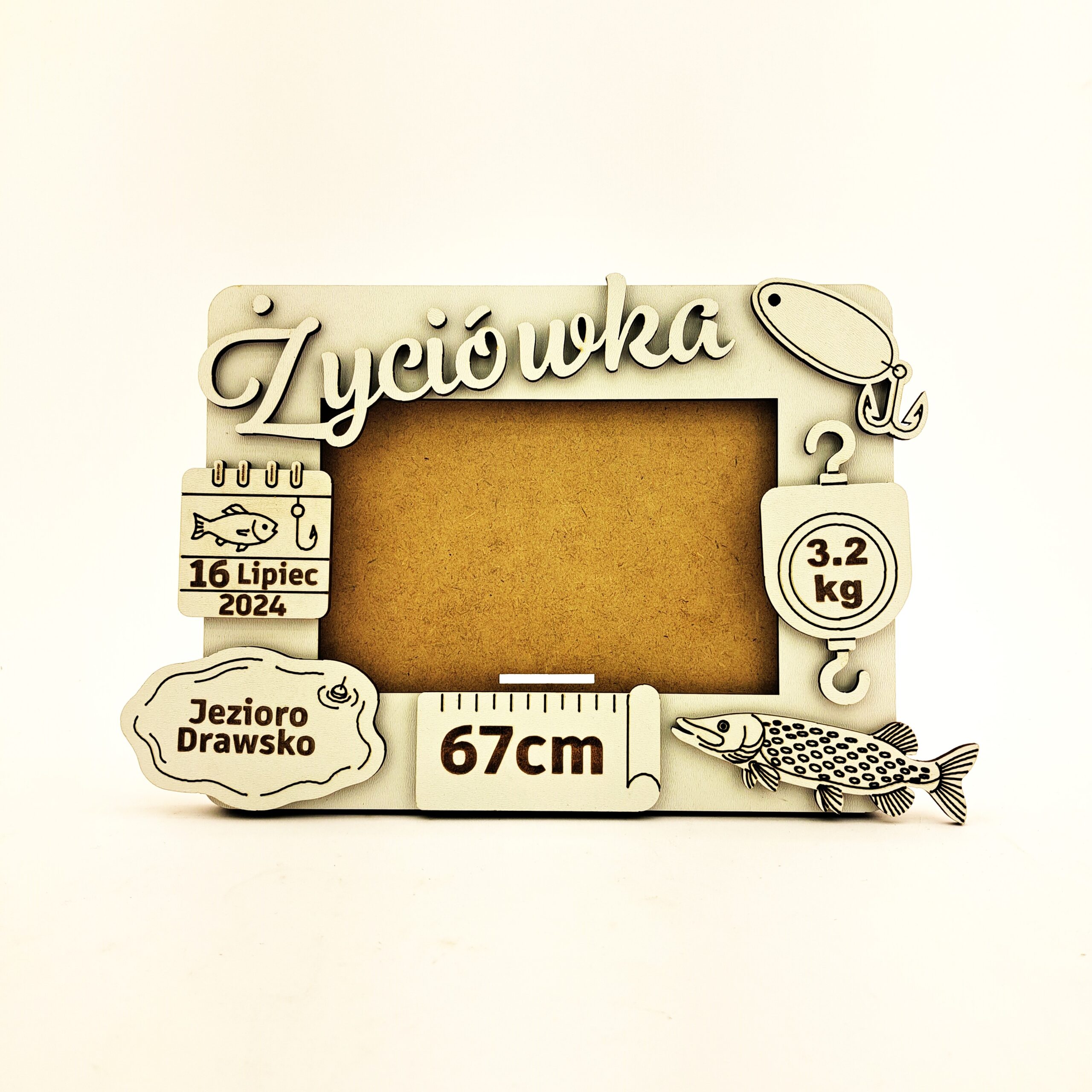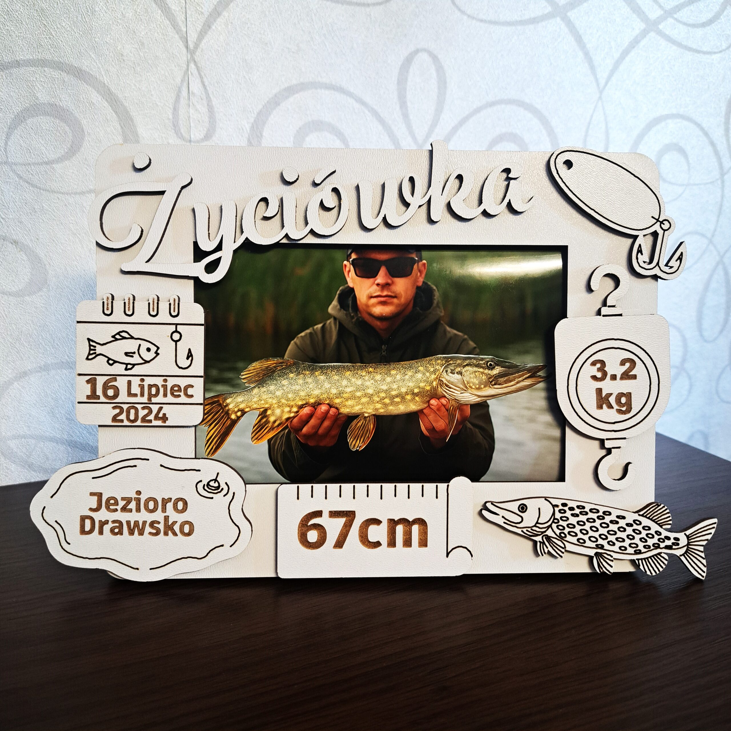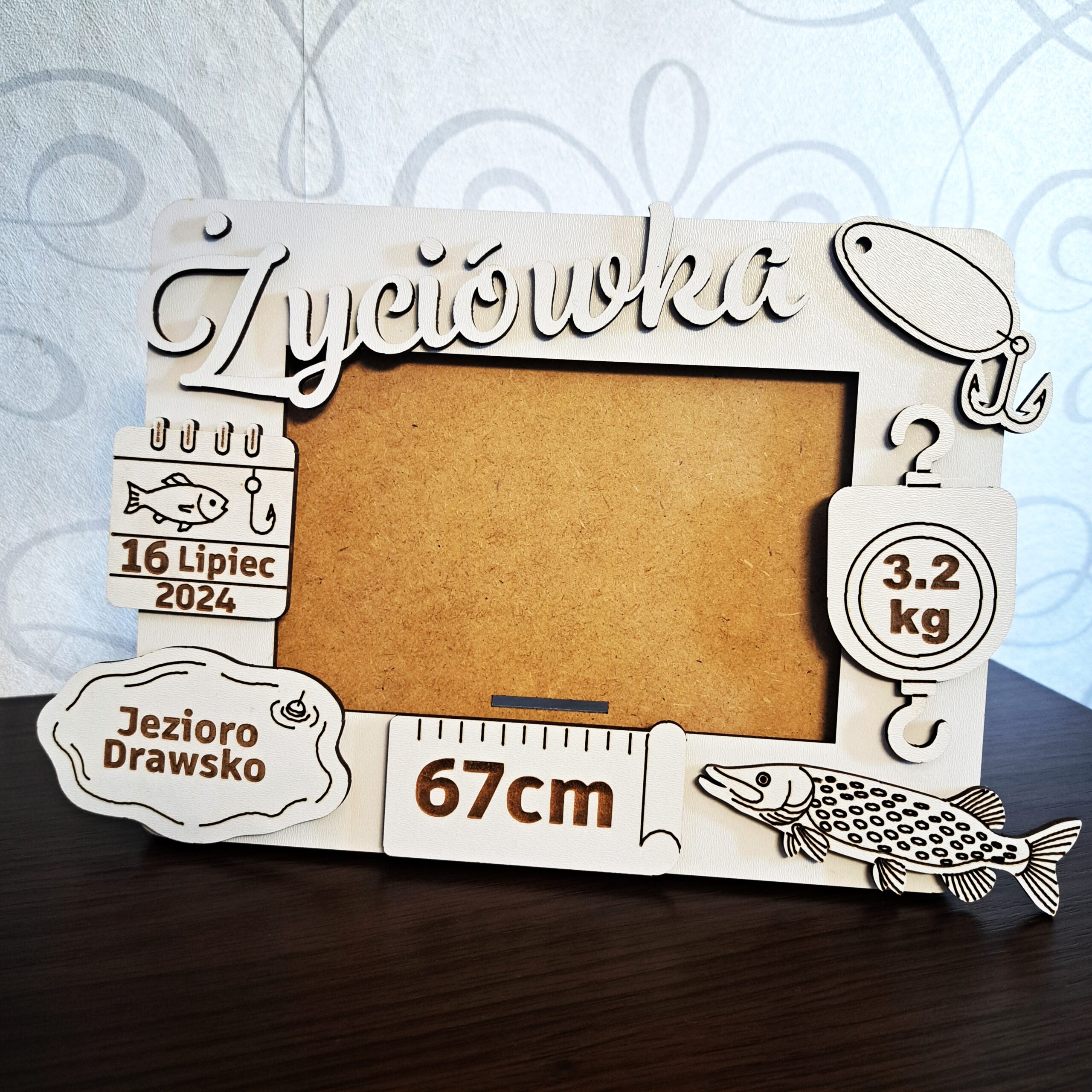 Szukasz niepowtarzalnej pamiątki dla zapalonego wędkarza? Oto personalizowana metryczka „Życiówka” w formie ramki na zdjęcie, wykonana z trwałej, lakierowanej płyty MDF o grubości 3 mm. To idealny sposób na uwiecznienie rekordowego połowu!