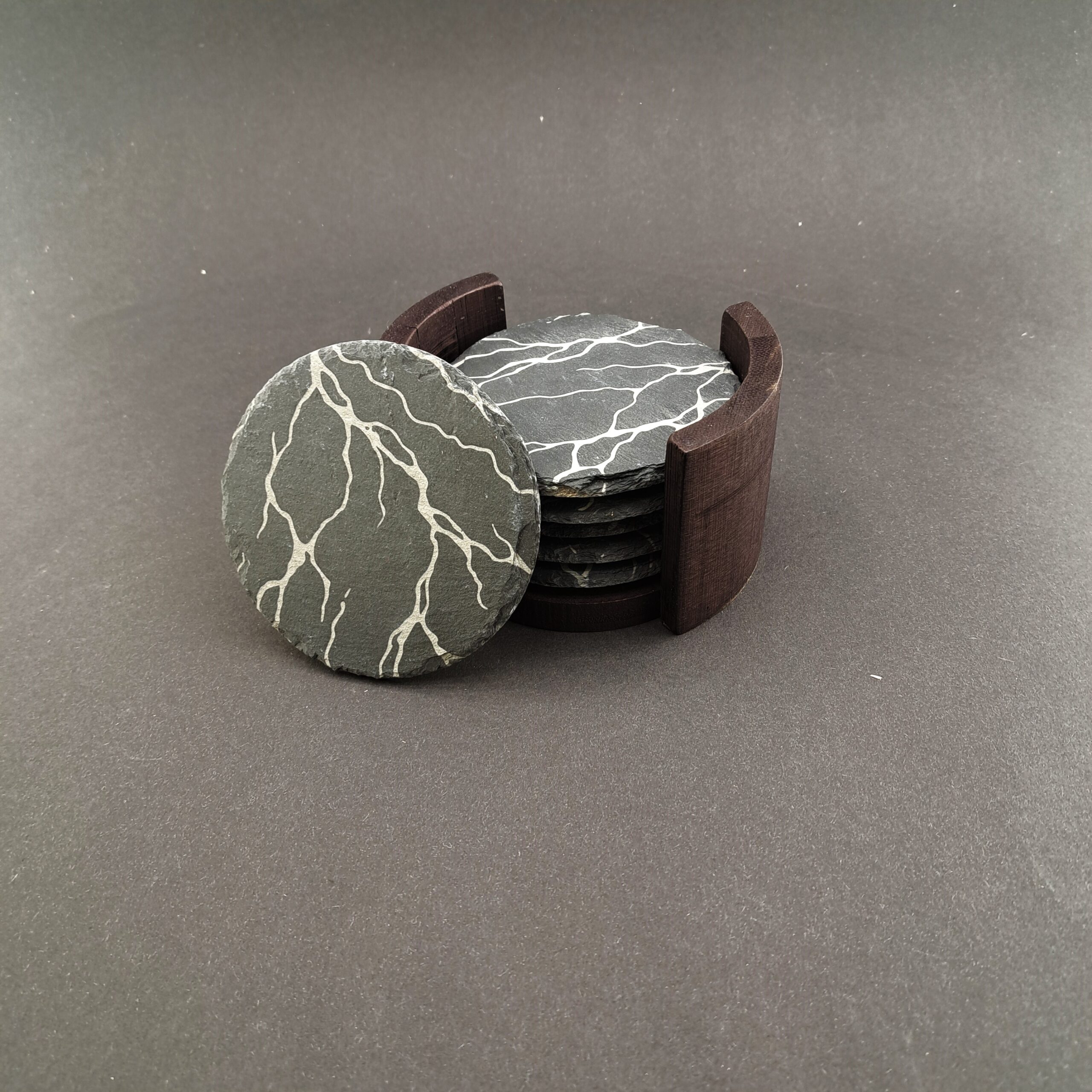 Łupek wyróżnia się surowym, naturalnym charakterem, a marmurowy wzór nadaje mu lekkości i elegancji. To połączenie sprawia, że podstawki świetnie pasują zarówno do wnętrz nowoczesnych, jak i klasycznych.