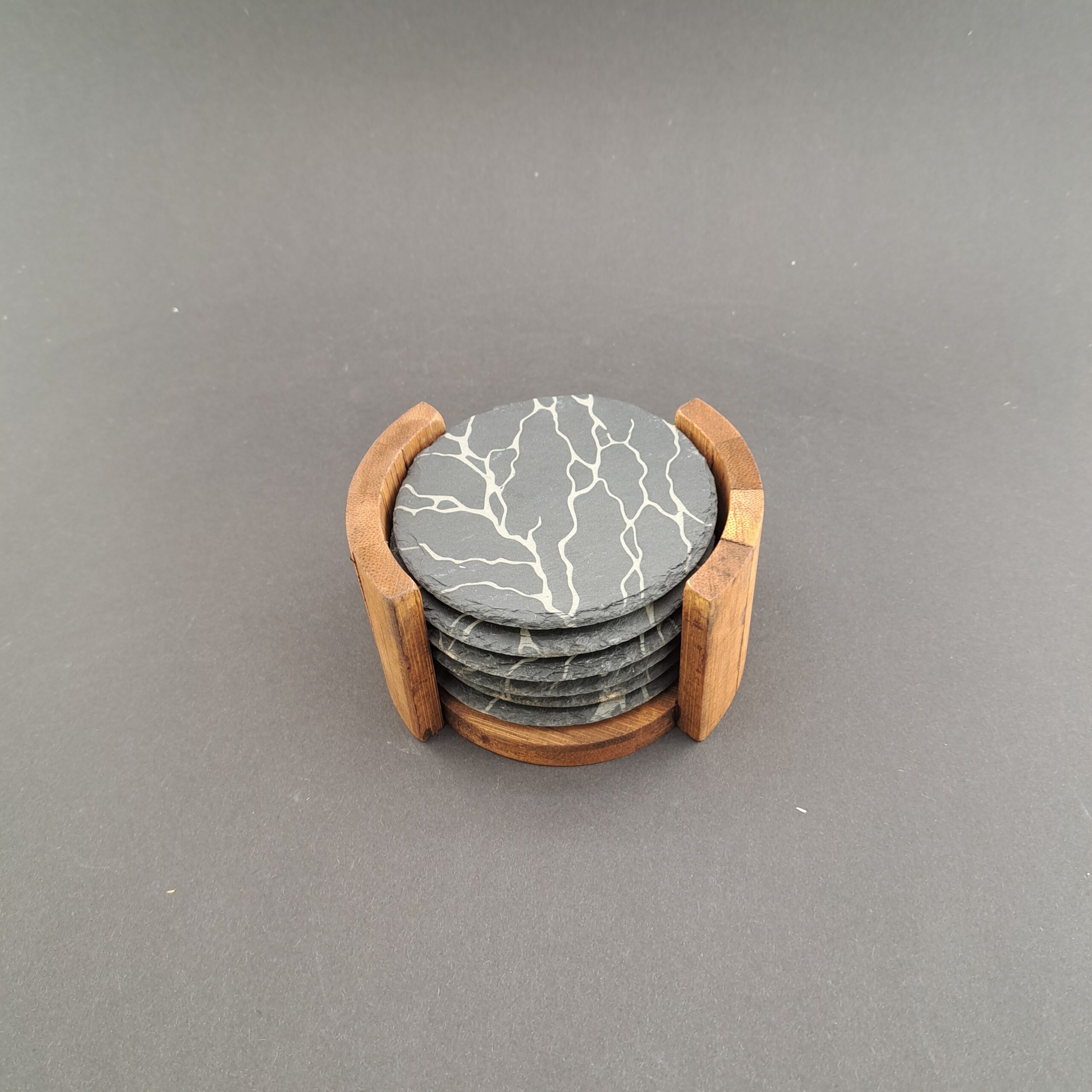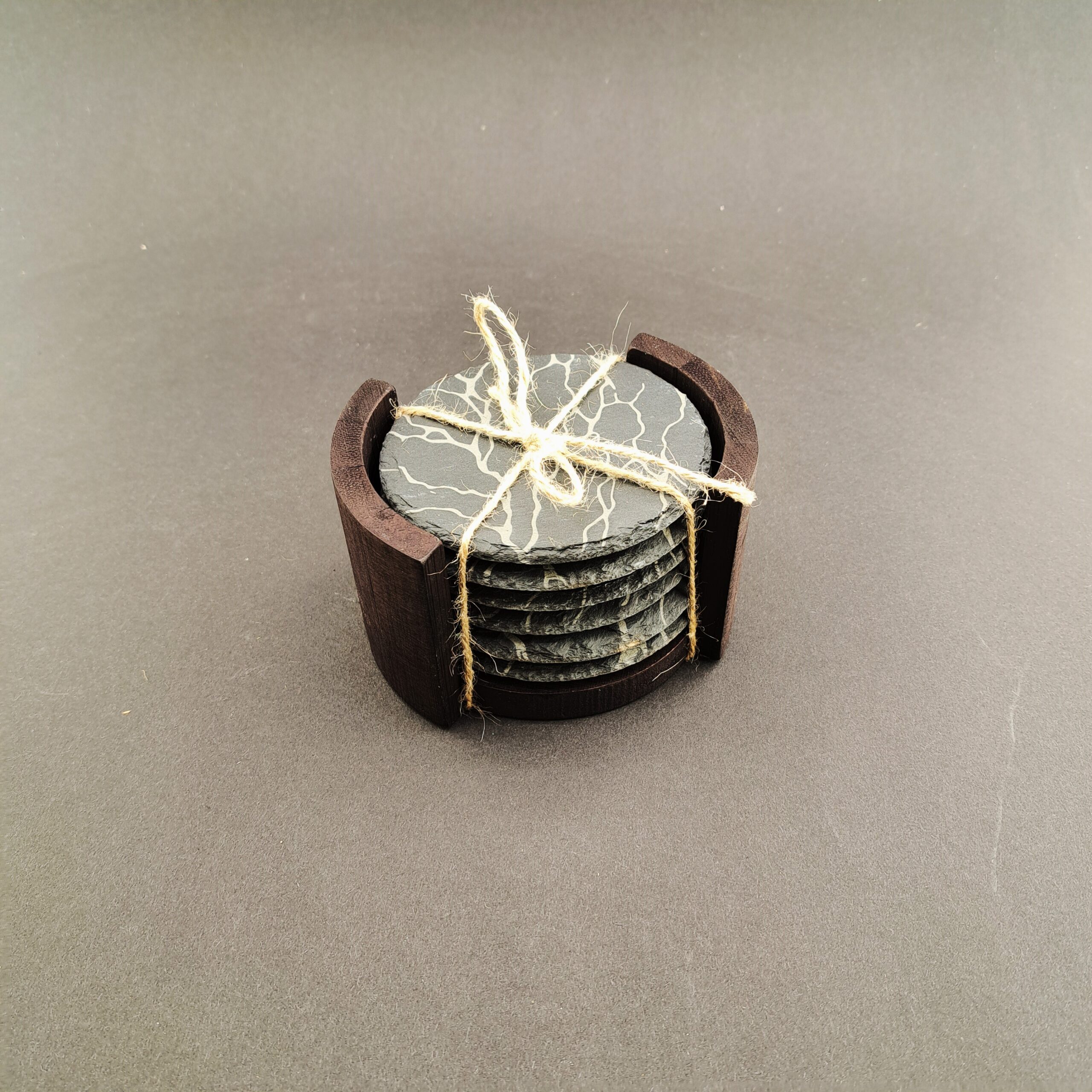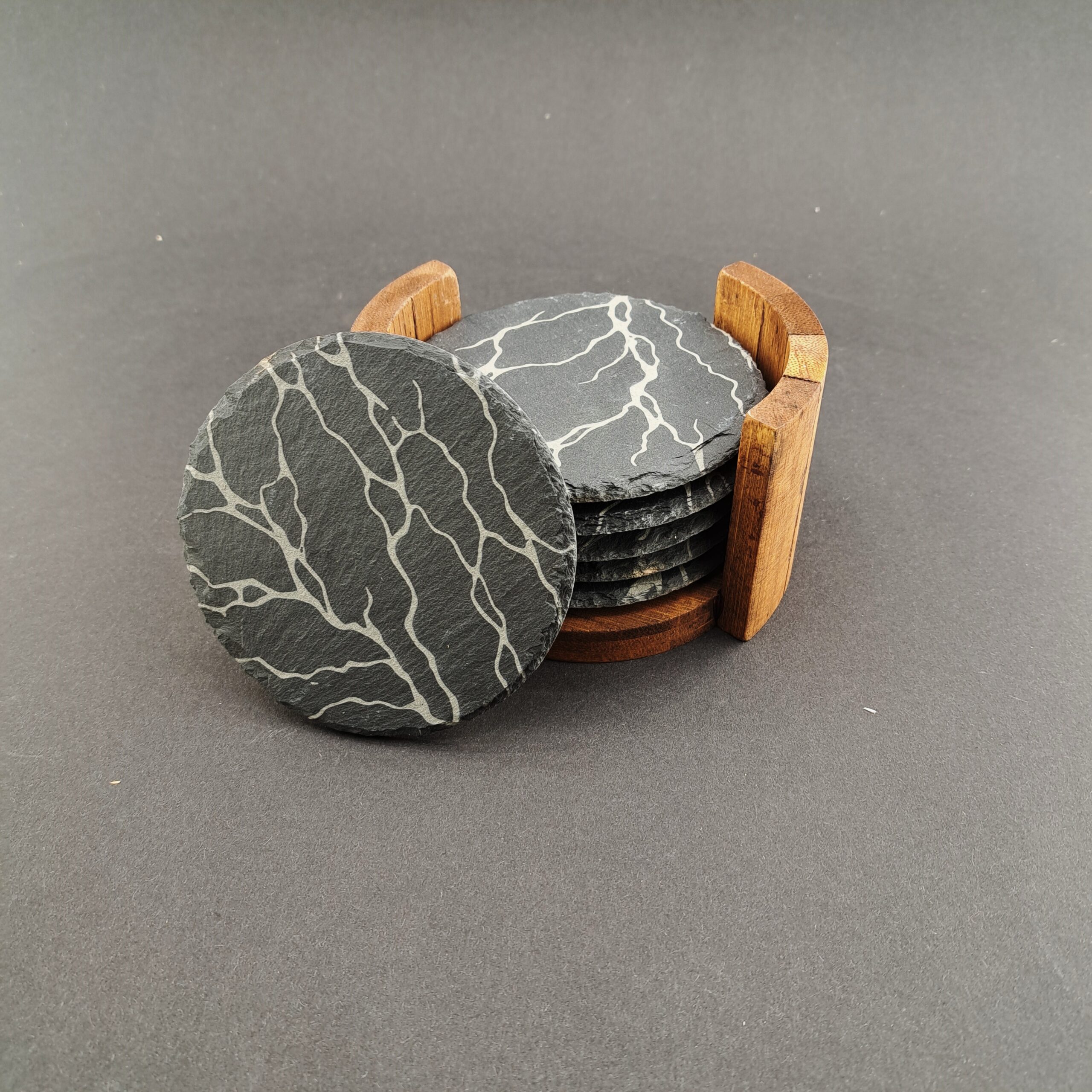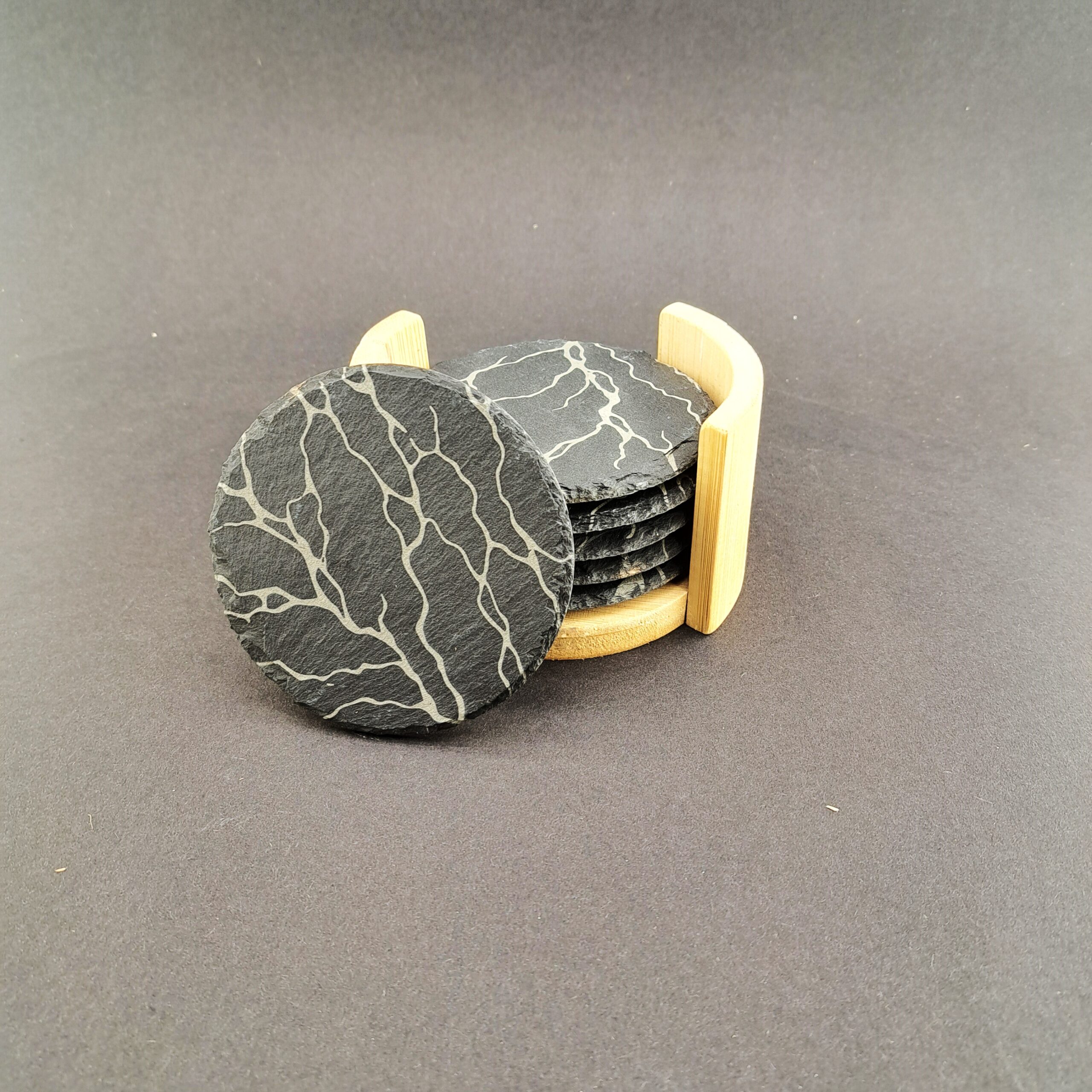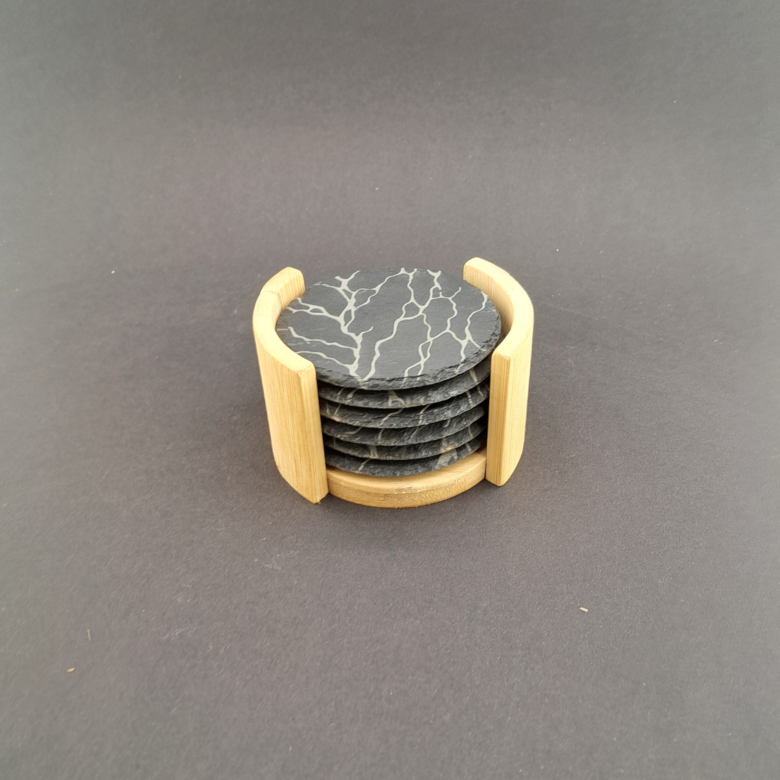 W zestawie znajduje się 6 okrągłych podstawek z łupka oraz bambusowy stojak, który nie tylko pomaga utrzymać porządek, ale również pięknie eksponuje podstawki.