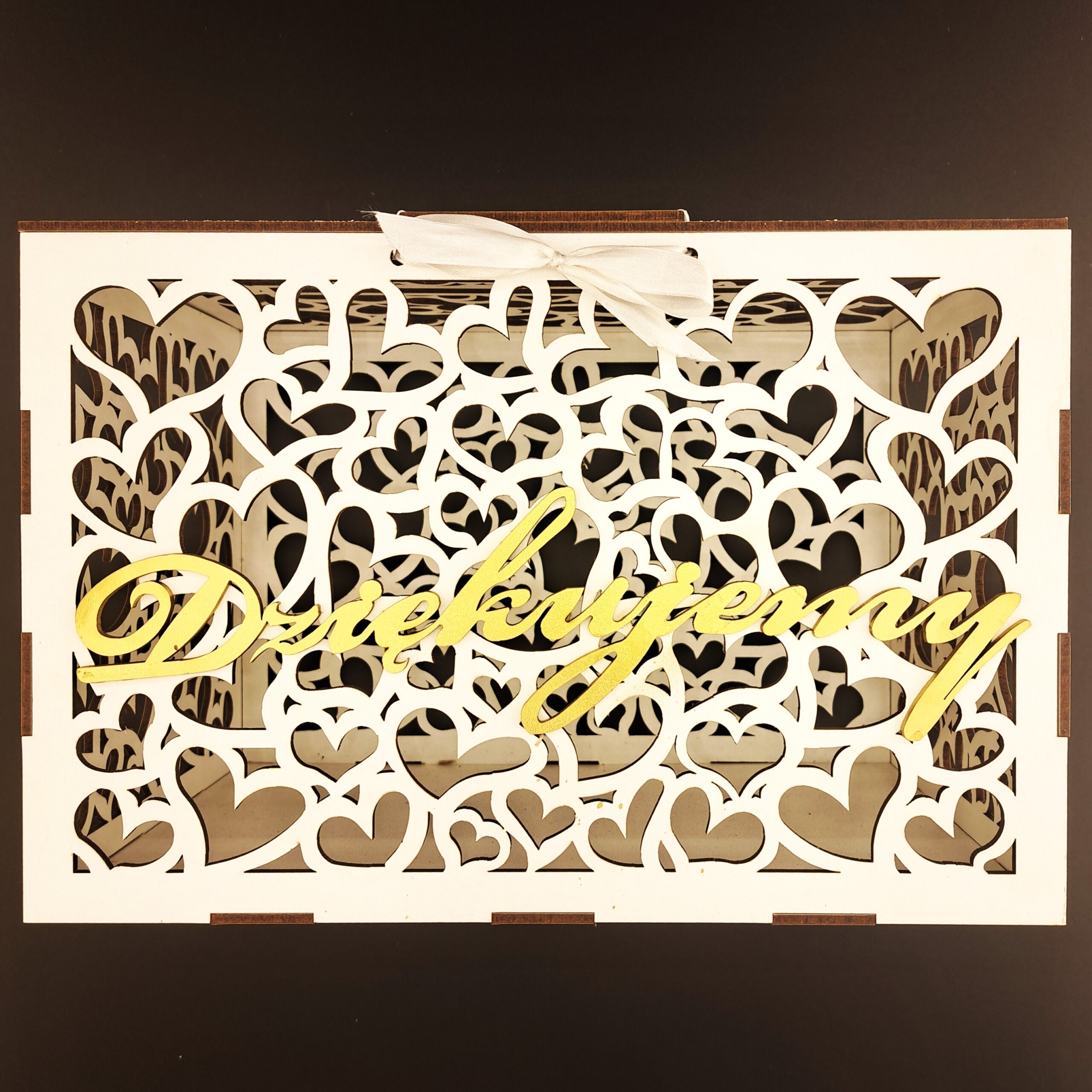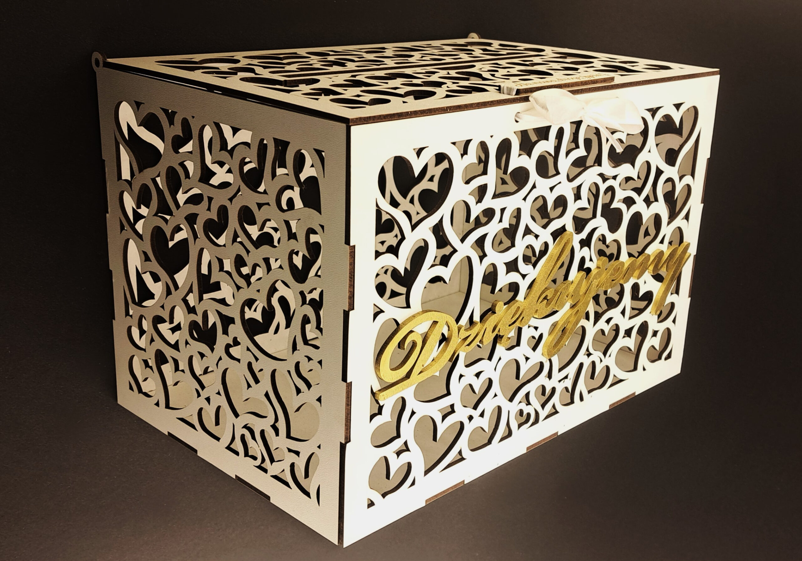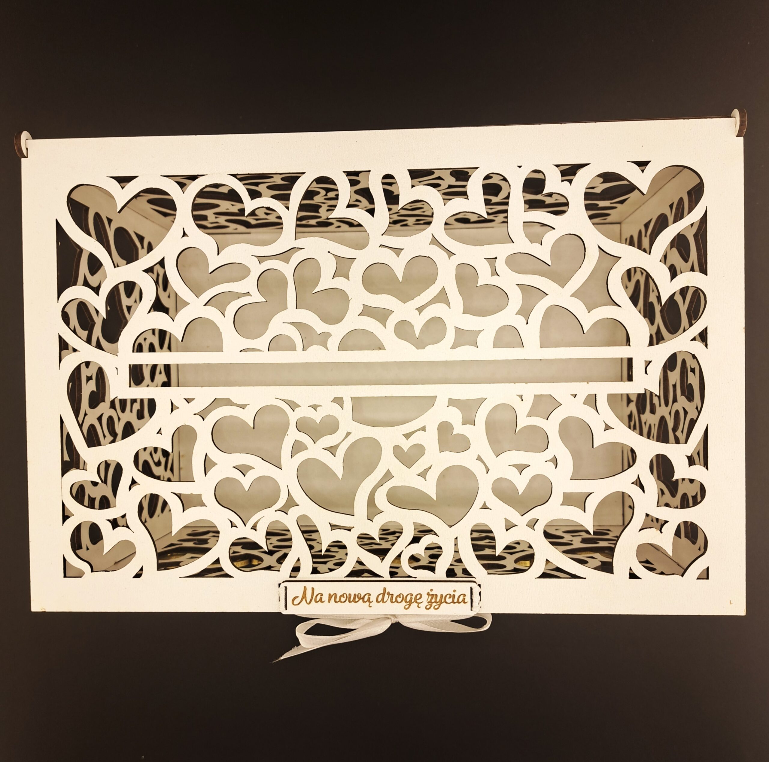 Skrzynka zamykana jest na białą, elegancką wstążkę, przez którą przechodzi napis „Na nową drogę życia” – również wycięty w HDF, co zapewnia spójny i stylowy wygląd. Dodatkowym elementem dekoracyjnym jest złoty napis „Dziękujemy” umieszczony z przodu skrzynki. Ten detal sprawia, że całość prezentuje się jeszcze bardziej elegancko i wyjątkowo, a jednocześnie podkreśla wdzięczność Młodej Pary wobec gości.